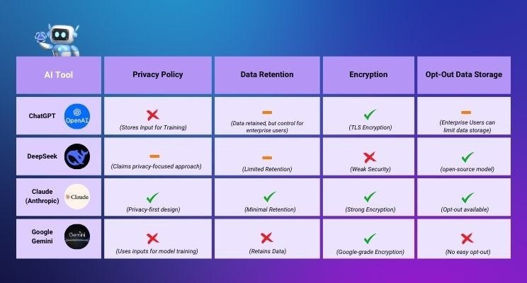 Not all AI tools have the same approach to privacy and security. Below is a comparison of some leading AI applications: