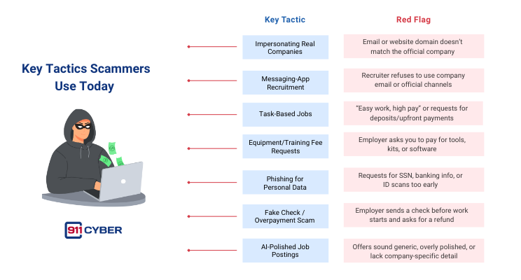 Scammers may impersonate real employers or even trick victims into unknowingly helping launder money.