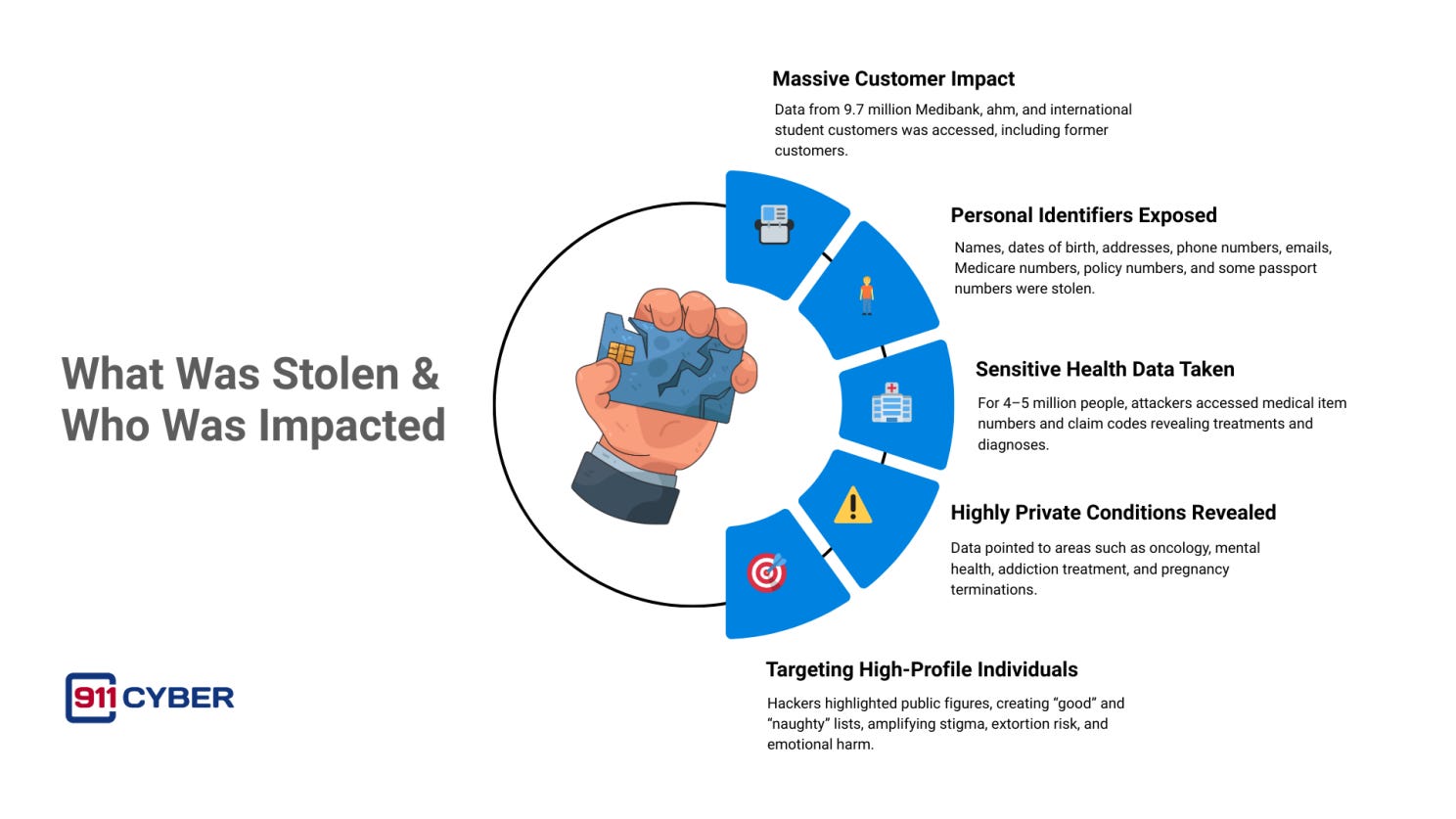 Unlike some other breaches, payment card data was not taken. However, the combination of identity information and health claims created a perfect storm for identity theft, targeted phishing, extortion, and emotional harm.