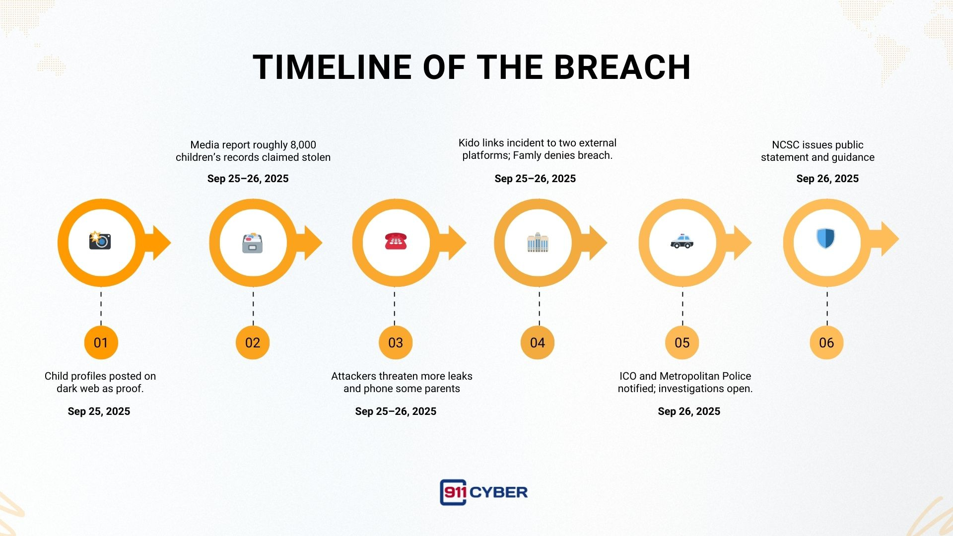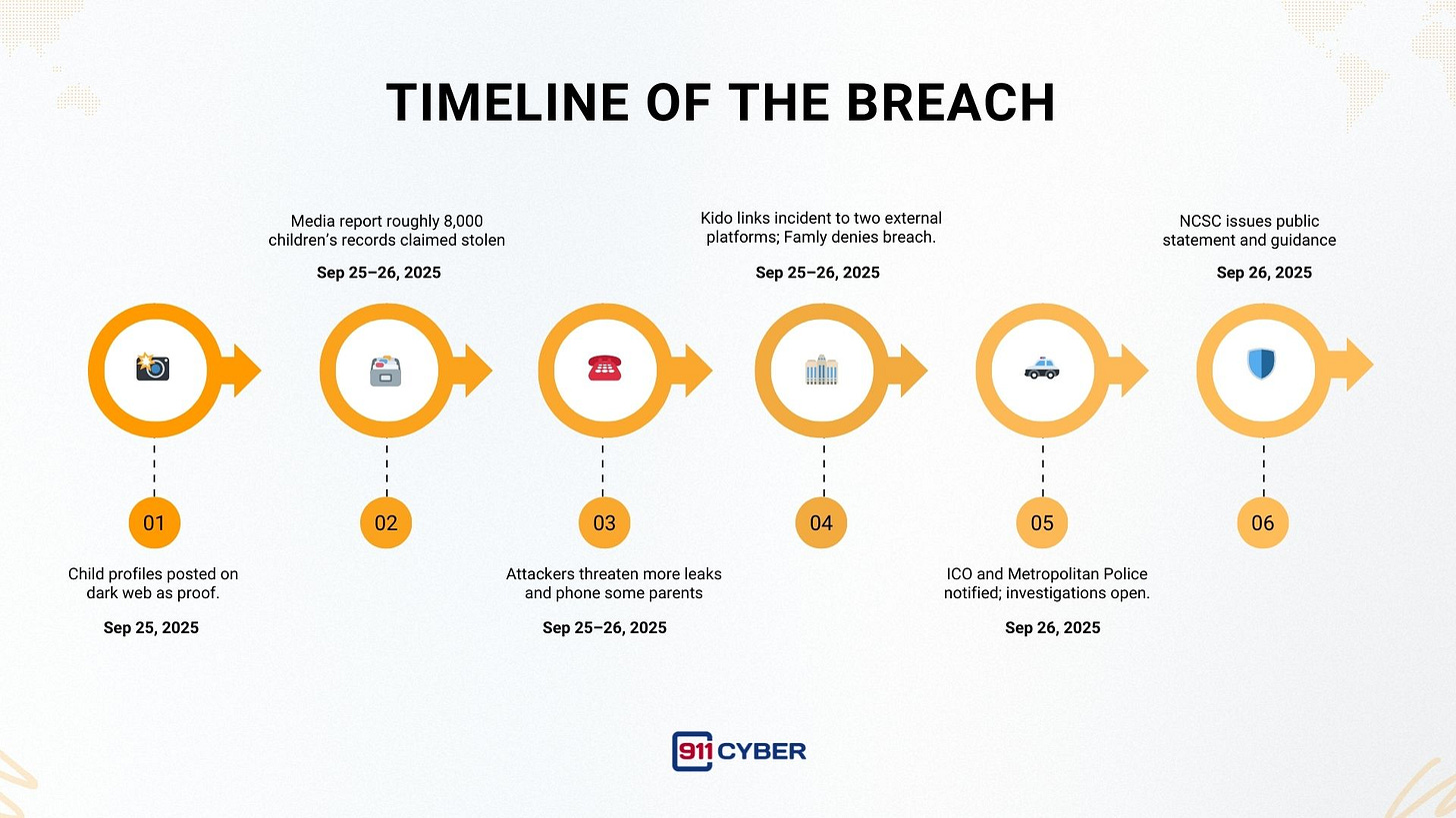 Public reporting and Kido’s statements place the disclosure in the week of 25 to 26 September 2025 and say the company’s UK operations were affected. Reports estimate roughly 8,000 children’s records were taken from Kido’s London nurseries.