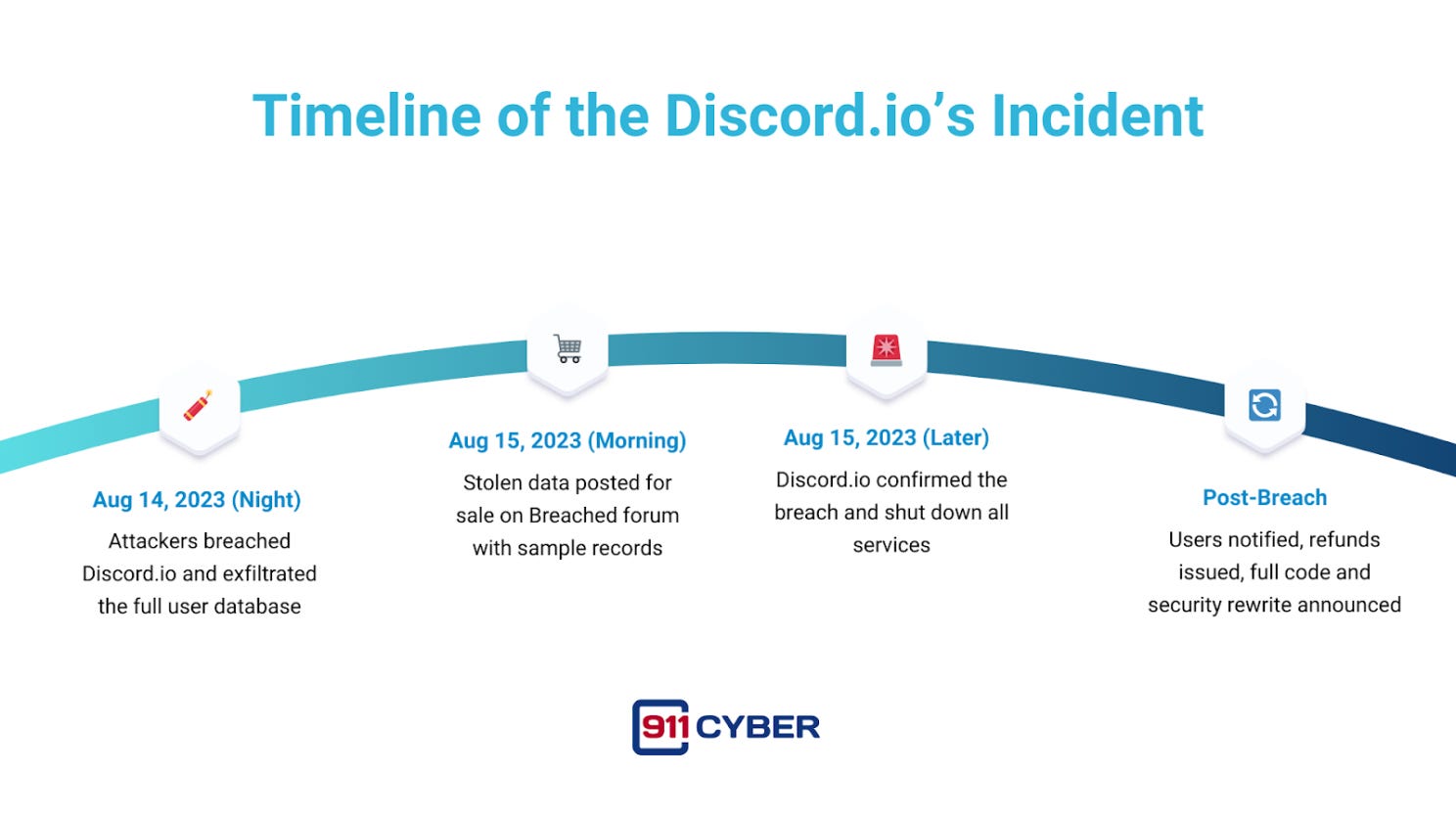 In mid-August 2023, Discord.io experienced a rapid and decisive security incident that unfolded over less than 24 hours. Attackers exploited a suspected code vulnerability to access and exfiltrate the platform’s database, with the breach becoming public the following morning when stolen records were offered for sale on a cybercrime forum.