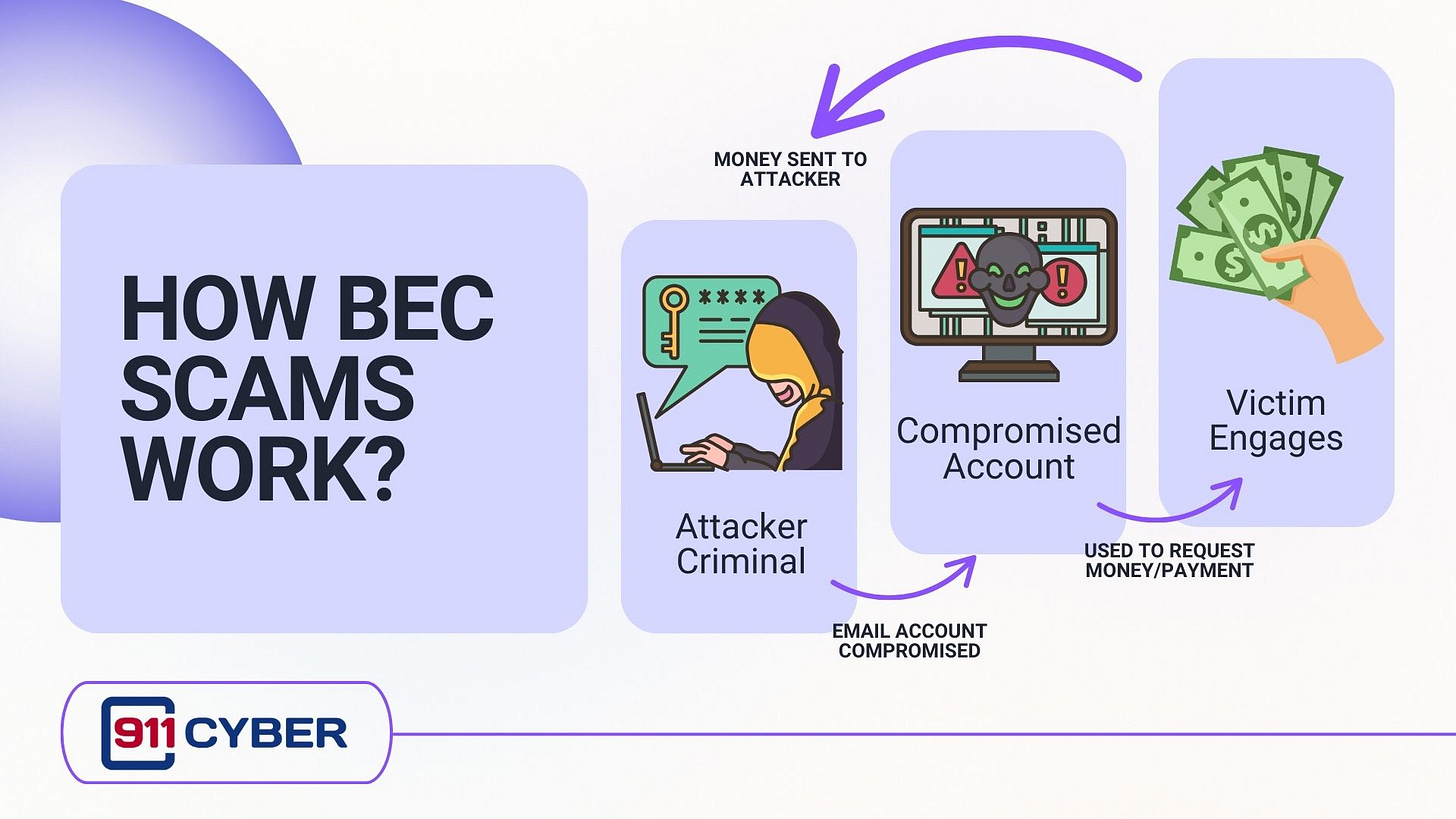 Suppose you’ve been affected by a BEC scam. In that case, you can contact 911cyber for immediate cybersecurity assistance or report the incident to your local law enforcement agency or the FBI’s Internet Crime Complaint Center (IC3) for support.