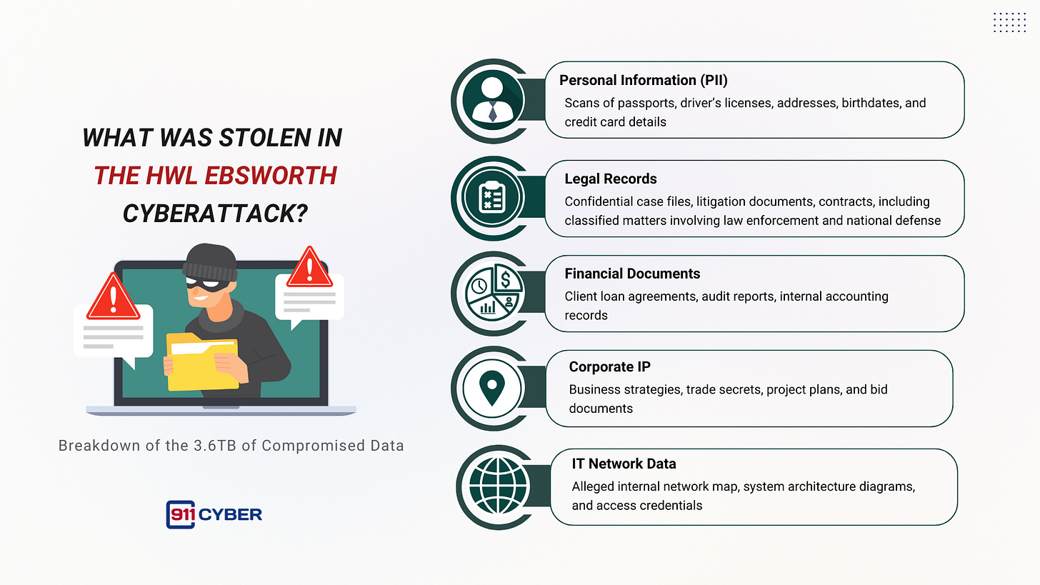 Approximately 3.6TB of data, consisting of around 2.4 million files, was stolen. The stolen files included sensitive personal information such as scans of passports, licenses, addresses, birthdates, and credit card details; confidential legal records including case files, litigation documents, and contracts related to law enforcement and national defense; financial documents such as client loan papers, audit reports, and internal accounting ledgers; corporate intellectual property including strategy documents, trade secrets, and project bids; and IT network maps allegedly containing internal system architecture and credentials.