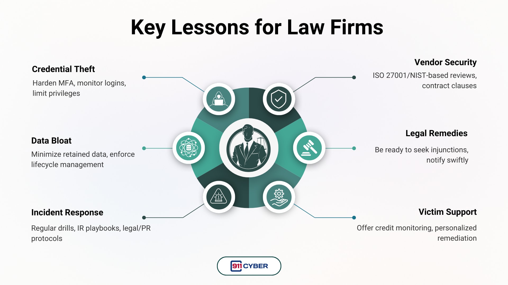 Key risk areas include credential theft, data bloat, vendor gaps, and legal fallout. Mitigation involves MFA, data minimization, strong IR plans, vendor vetting, legal readiness, and victim support.