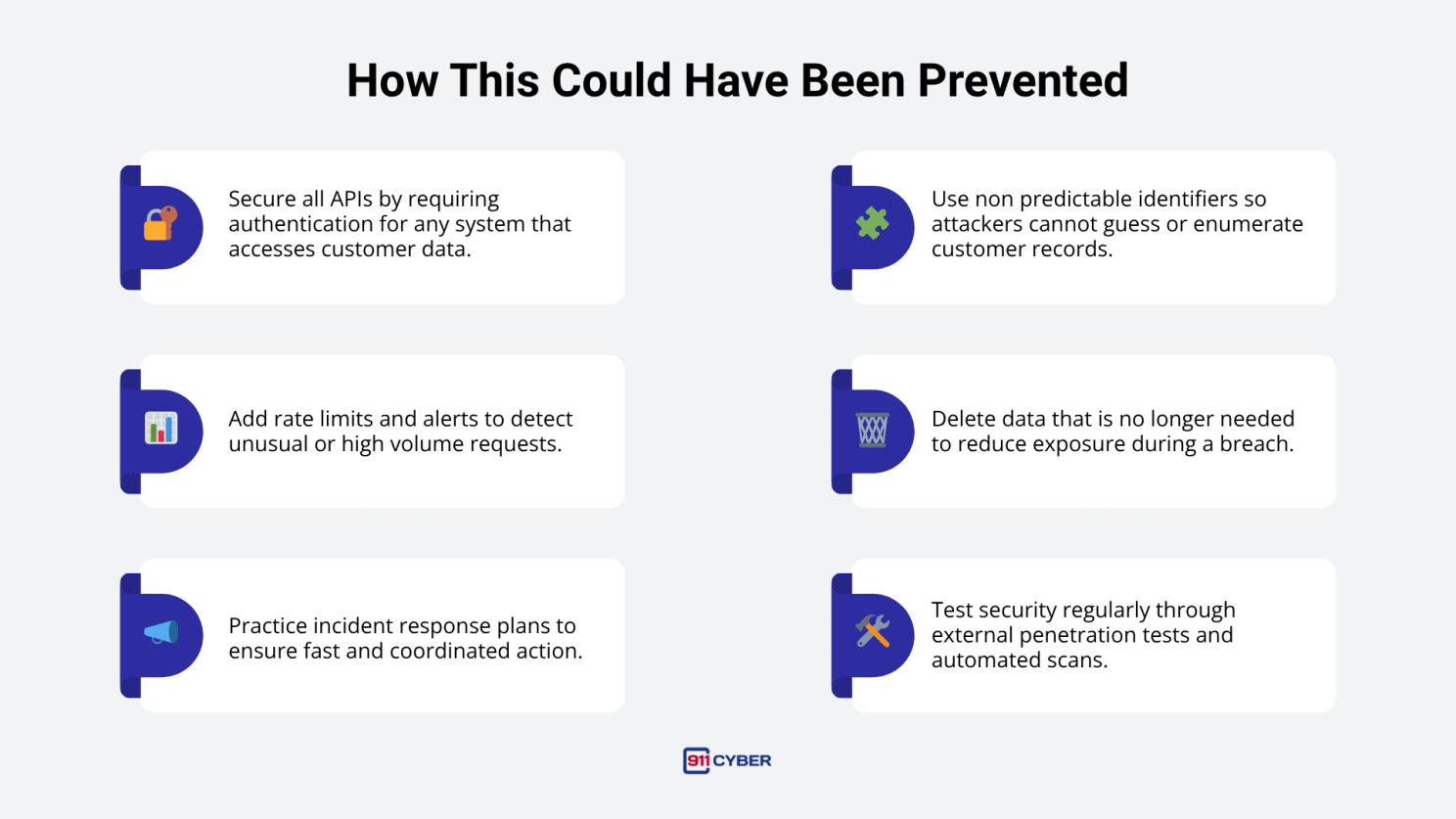 The API allowed access by customer ID, and these IDs followed a simple numerical sequence. Once the attacker found a valid ID, they could enumerate millions of others by increasing the number.