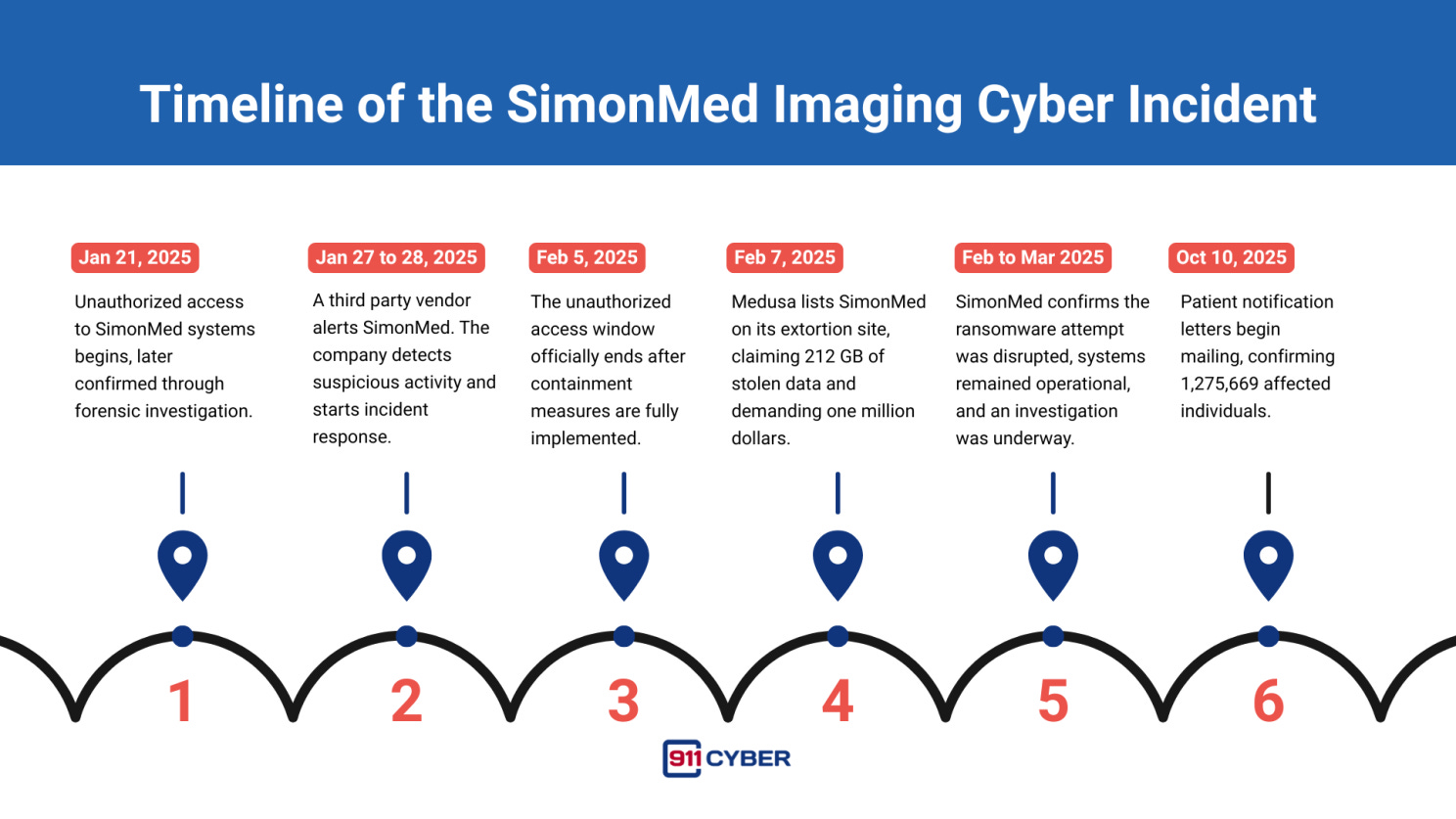 On January 27, 2025, one of SimonMed’s vendors notified the company that it was experiencing a security incident. The next day, SimonMed identified suspicious activity inside its own network. A later forensic investigation determined that unauthorized access had already been present since January 21 and continued until February 5.