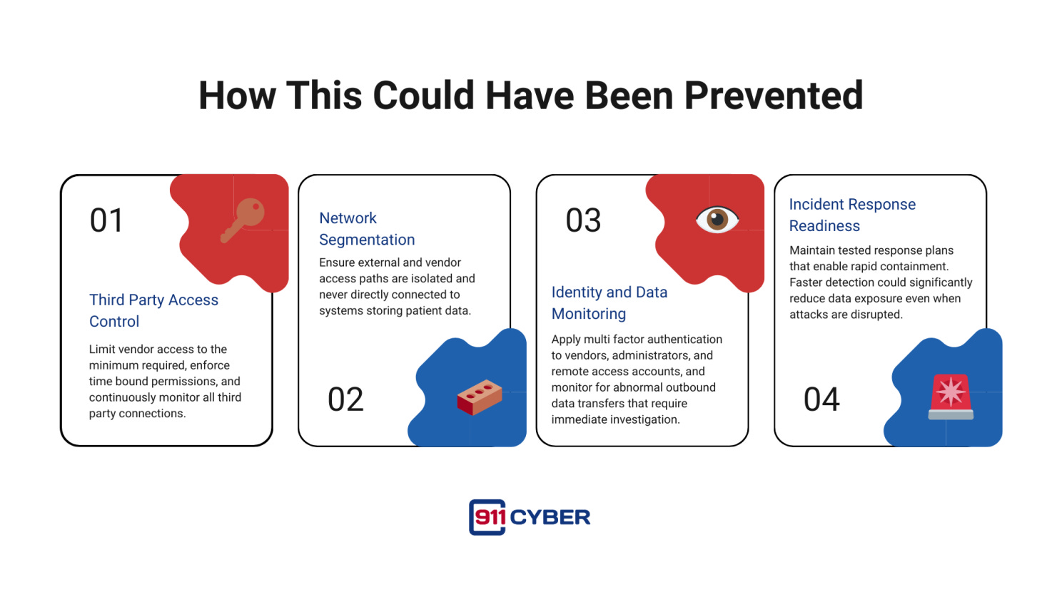 Once suspicious activity was confirmed, SimonMed initiated containment actions that included password resets, strengthened authentication, deployment of enhanced endpoint monitoring, and removal of direct third party access to internal systems.