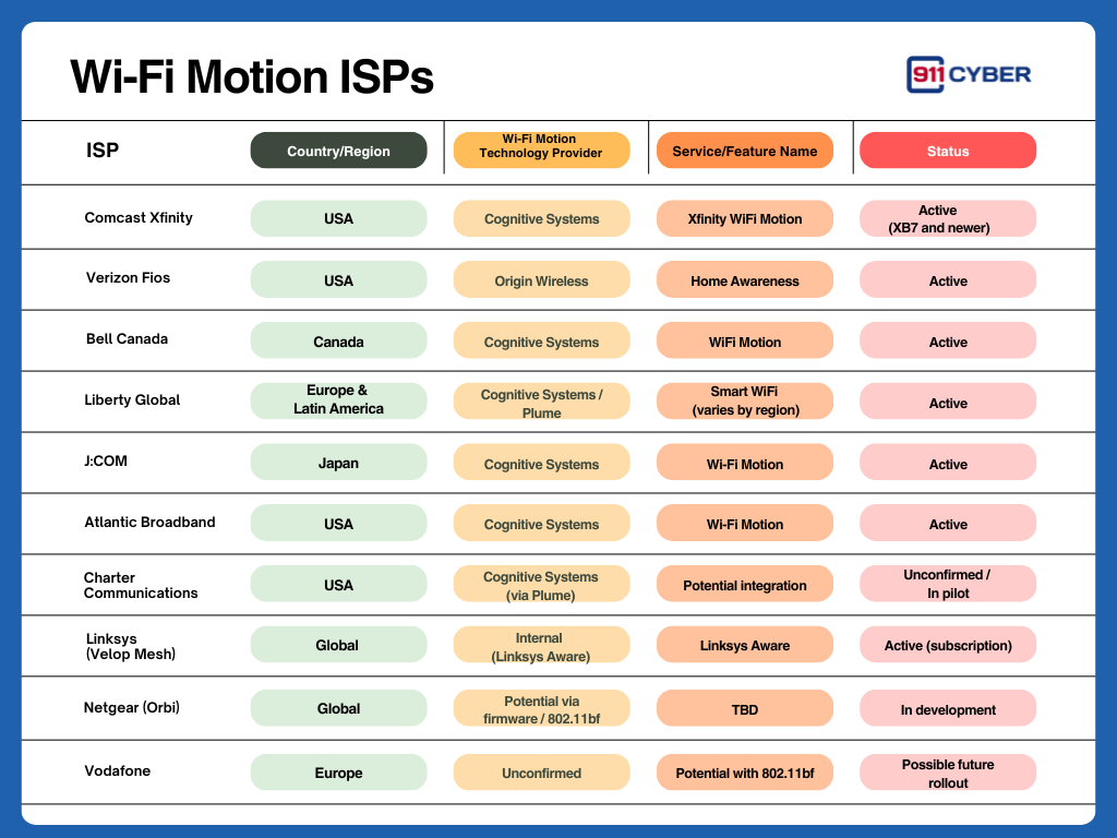 Comcast may be leading the charge in the U.S., but WiFi Motion is quickly becoming a global phenomenon. Canadian company Cognitive Systems, which powers Comcast’s motion-sensing feature, has already licensed the technology to more than 120 internet providers worldwide, reaching over one million homes. Providers in Japan, Canada, and across Europe have quietly integrated similar motion-sensing capabilities into their gateways. Verizon Fios now offers a “Home Awareness” service using Origin Wireless, and Linksys includes motion detection in its mesh systems under the name Linksys Aware. What started as a niche feature is being normalized across the industry, without most users ever realizing their routers are evolving into indoor radar systems.